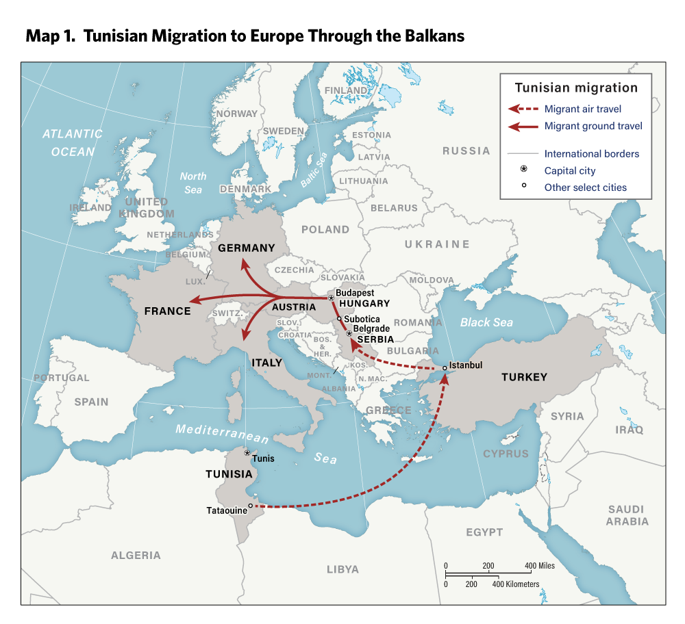 28 Achref Chibani, “Tunisians Find New Road to Europe in The Balkans,” Meshkal, September 27, 2022, https://meshkal.org/tunisia-migration-europe-balkans/.